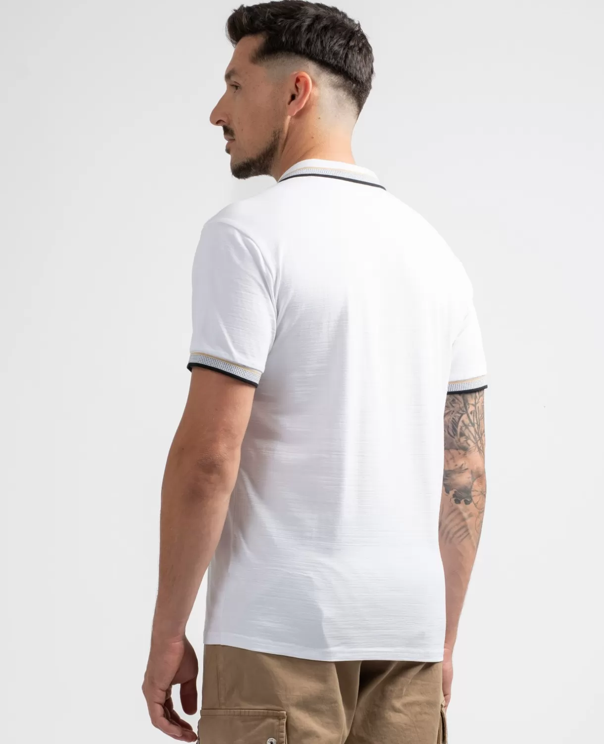 Slim fit and stretchy material for this timeless piece of the male wardrobe. Discreet logo on the chest and colored trim on the collar and sleeves.